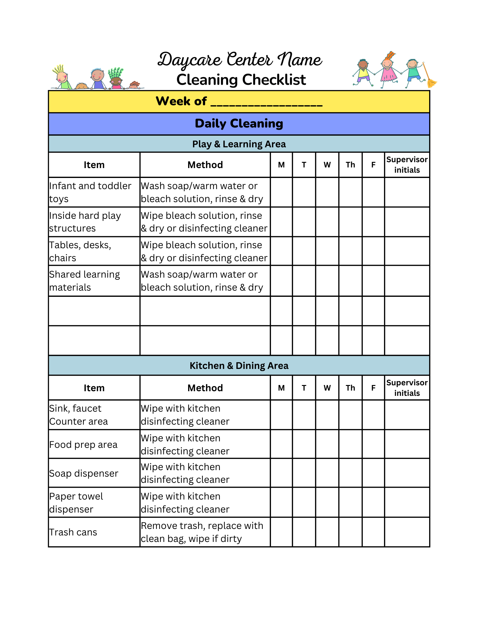 Keeping a daycare clean and sanitized is crucial for the health and safety of the children who attend. A well-organized daycare cleaning checklist template can help ensure that all areas are properly cleaned and maintained on a regular basis. By following a detailed cleaning checklist, daycare staff can stay on top of daily, weekly, and monthly cleaning tasks, creating a safe and healthy environment for children to learn and play.